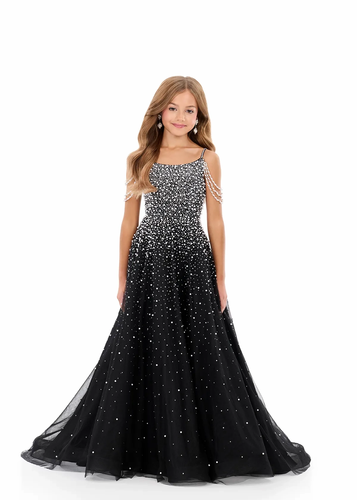 Turn every head in this stunning ASHLEYlauren Kids Tulle Ball Gown. This glamorous gown features a square neckline and delicate beaded straps with fringe detailing that add a touch of sparkle and movement. The press-on crystal embellishments create a dazzling ombré effect that cascades beautifully down the full tulle skirt, giving the gown a radiant and sophisticated finish that’s perfect for the stage or any formal event.